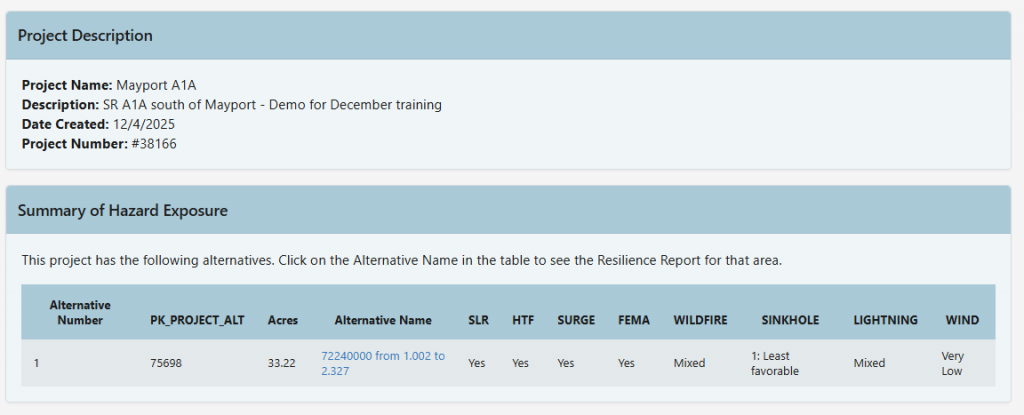 The benefits of this project include streamlined access to resilience and flooding data for better screening of potential impacts and better project scoping. The Resilience Report can assist in data gathering for PD&E and/or corridor studies and can provide resilience screening for LRTP projects. The Resilience Report could also be used to identify areas in need of more refined analysis (e.g. engineering-level studies). This project supports FDOT’s Resiliency Policy 000-525-053 by developing geospatial tools to facilitate the identification of risks related to SLR, flooding, and storms and assessment of potential impacts.